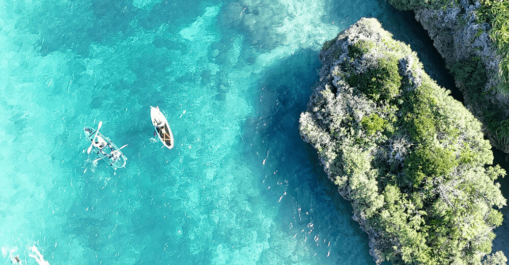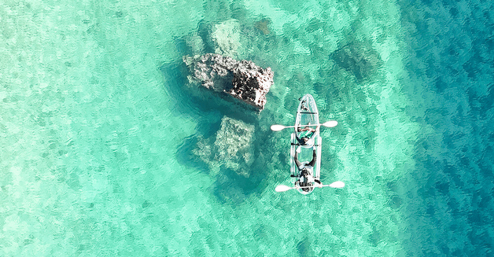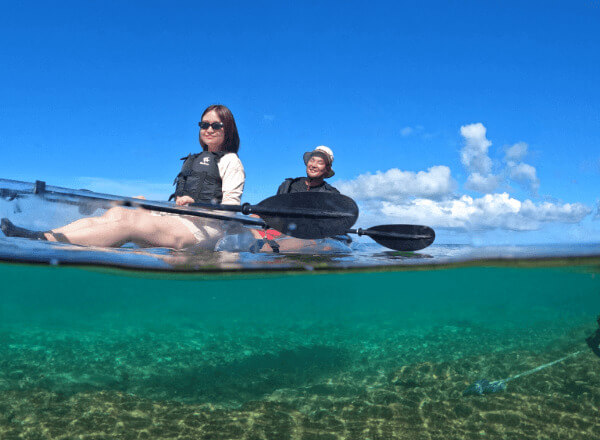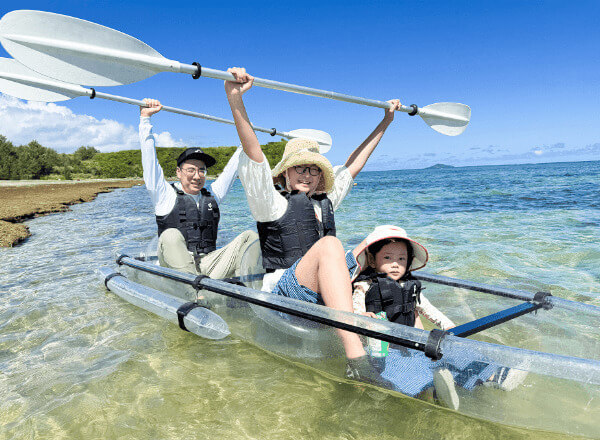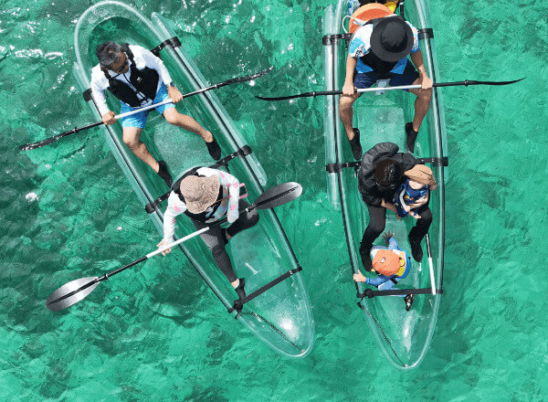 宮古島で大人気のクリアカヤック。透明なボートが特徴で、海に浮いているような感覚を味わえます。